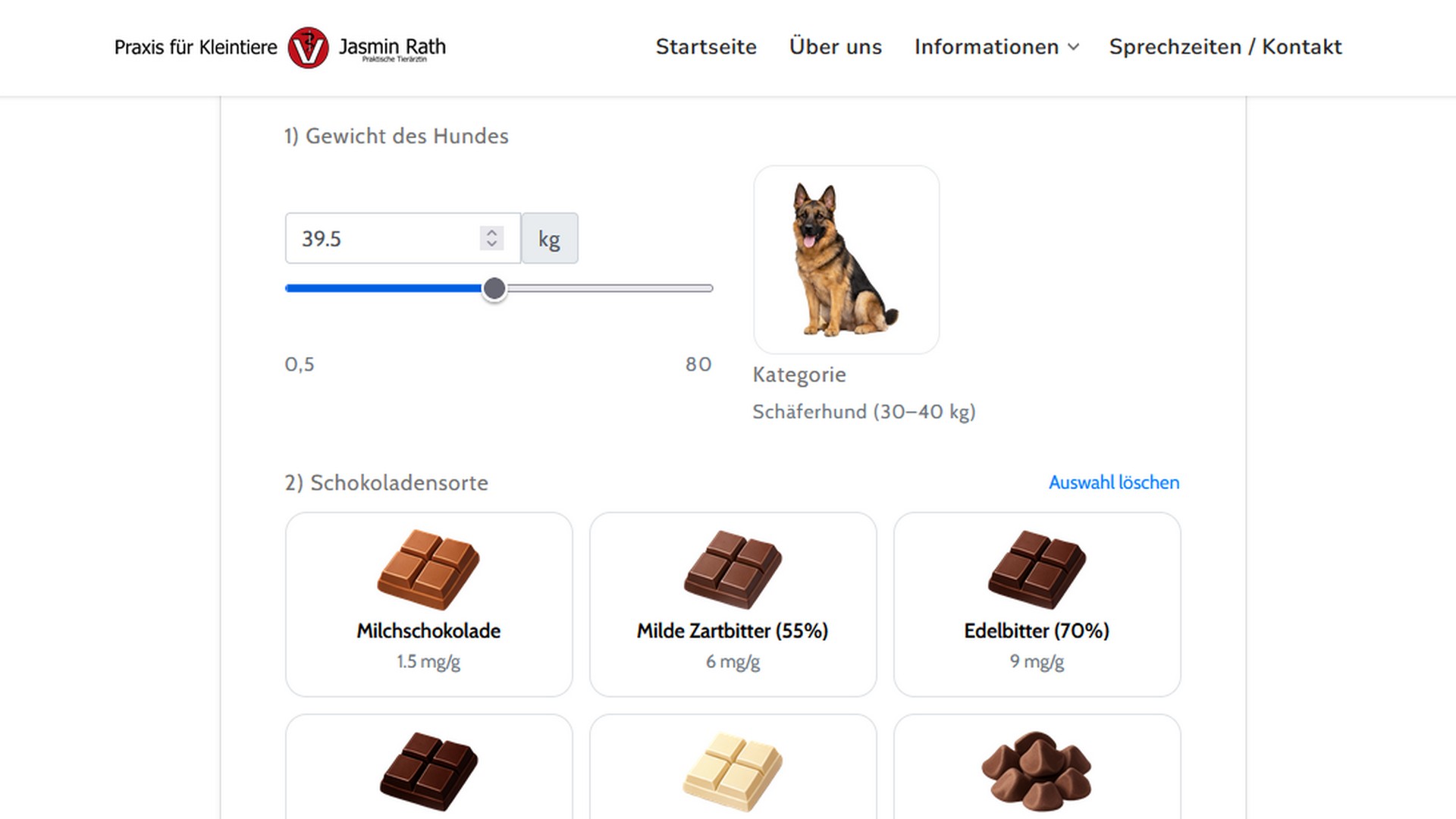 Schokolade kann für Hunde und Katzen gefährlich sein. Mit unserem Schokoladenrechner erhalten Sie eine schnelle Ersteinschätzung, wie kritisch eine bestimmte Menge je nach Tiergewicht und Schokoladenart sein könnte